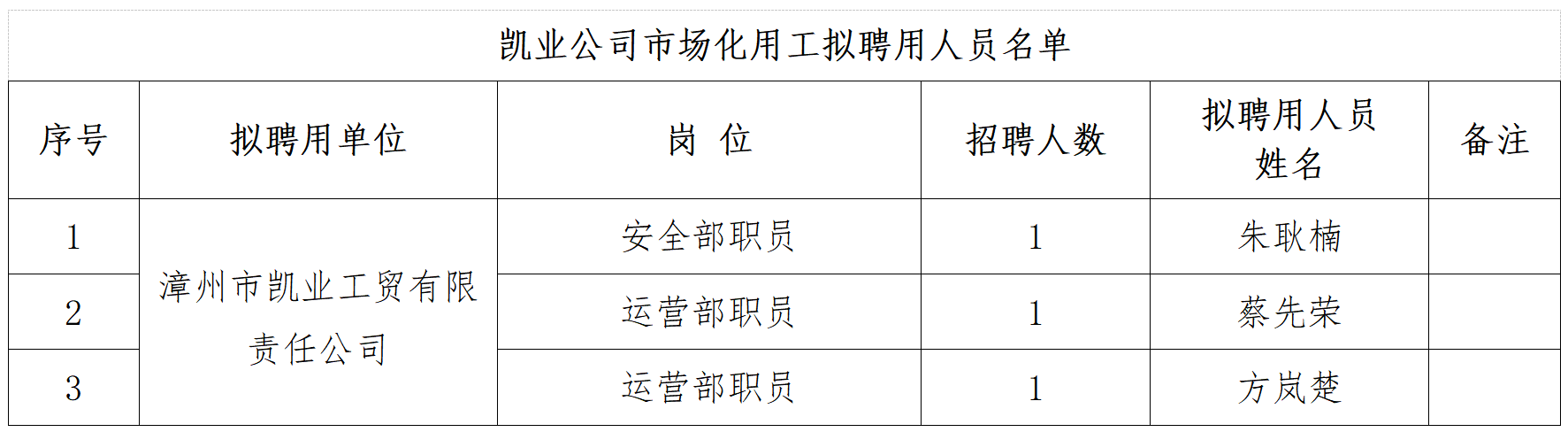 根據(jù)《漳州市交發(fā)工貿(mào)集團(tuán)有限公司所屬凱業(yè)公司市場化用工人員招聘公告》相關(guān)規(guī)定,經(jīng)報名、資格審查、面試、背景調(diào)查、體檢、政審等程序,現(xiàn)將擬聘用3名人員予以公示,具體名單如下: